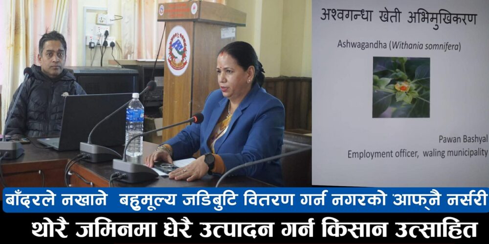 “नगरपालिकाले पंतञ्जली अनुसन्धान प्रतिष्ठानमार्फत प्राप्त बीउ प्रयोग गरी आफ्नै नर्सरीमा बेर्ना उत्पादन गरेको छ। अहिले वालिङ नगरभित्र अश्वगन्धाको नर्सरी निर्माण भइसकेको छ र किसानहरूलाई आवश्यक विरुवा वितरणको तयारी भइरहेको छ ।” सुशील सुवेदी स्याङजा – २३ कार्तिक वालिङ नगरपालिकाका इच्छुक र अग्रणी किसानहरूलाई लक्षित गरी बहुमूल्य जडिबुटी खेतीबारे अभिमुखीकरण कार्यक्रम नगरपालिकाको सभाहलमा सम्पन्न भएको छ …
